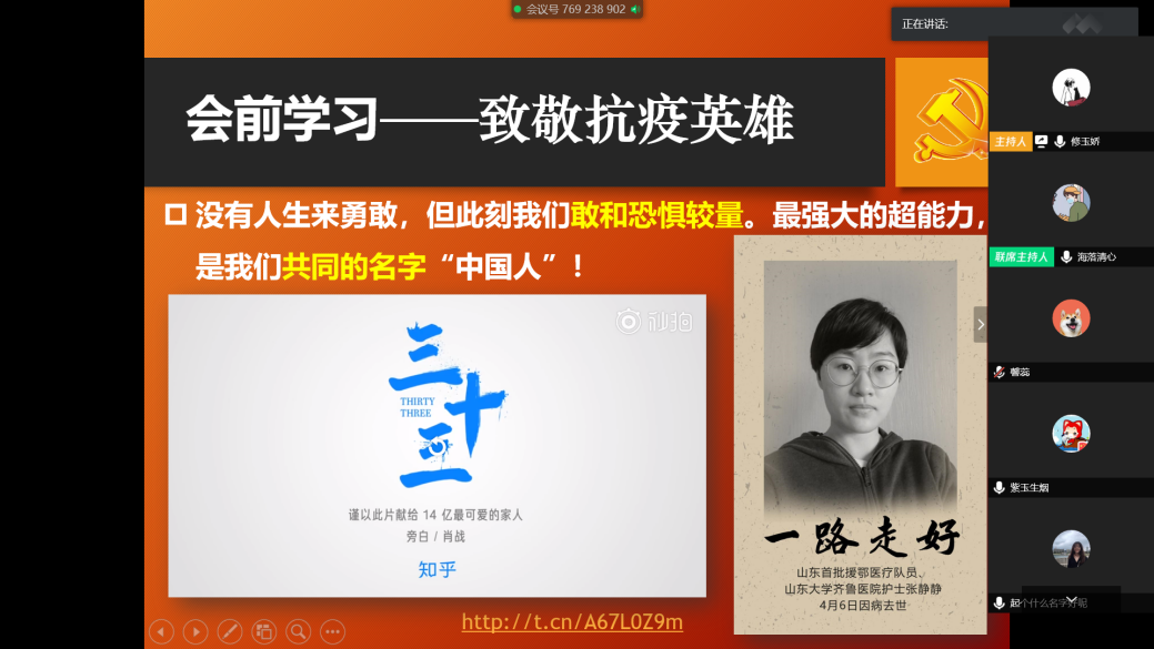 会前,支部书记带领大家一起再次缅怀了四川凉山火灾中的英雄们,致敬了在这次新冠病毒抗战的英雄,观看记录短片《三十三》,分享了学校关于抗战疫情的设计作品。以援鄂医疗队员张静静的事迹为例,我们深刻地明白没有人生来勇敢,但此刻我们敢和恐惧较量,最强大的超能力,是我们共同的名字“中国人”!让我们再次为最美天使致敬!