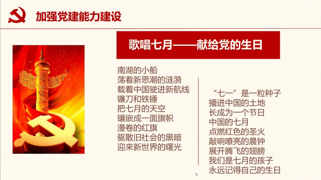 会议分为“微讲堂”、“微故事”、“微建设”、“微讨论”四部分。会议开始,支部书记侯丹同志分享了《迎党的生日——红色的追寻:日出东方》主题“微讲堂”,以学习史料、观看视频的形式,带领支部成员回顾了中国共产党成立开天辟地的光辉历史,学习了“七·一”建党节的由来,了解了第一篇建党纪念文章、第一次建党纪念活动、第一次出版建党纪念特辑等相关历史,支部成员对于中国共产党筚路蓝缕的发展历程有了更为深刻的认识。王诗童同志朗诵了诗歌《歌唱七月-献给党的生日》,引发了支部成员的共鸣。