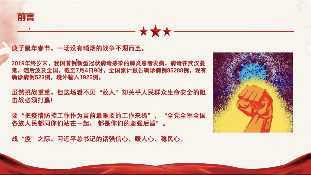 王嘉瑜同志进行了《共同战“疫”,我们在行动》主题“微故事”分享,回顾了从春节期间武汉坚强抗疫到全国人民众志成城共同抗击疫情的大事件,分享了身边优秀战役榜样我院乔群博博士通过学院向学校捐赠防护物资的事例,以及钟南山、李兰娟等党员及医护人员团队的先进事迹。支部成员学习后,纷纷表达了对从疫情暴发到现在为止依旧奋战在抗击疫情第一线的医务工作者们以及为社会各行业维持运转而默默奉献的基层工作者们崇高的敬意,并表示作为党员将继续扎根在自己的学习工作岗位上,听从党和国家指挥,继续与疫情抗争。