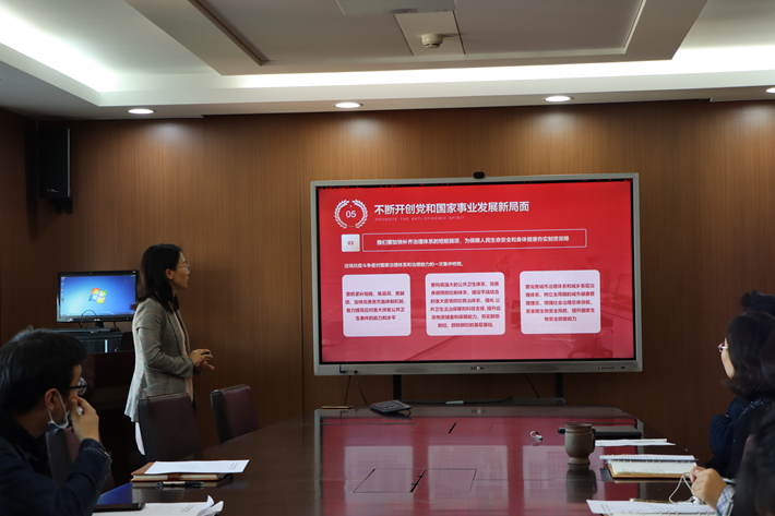 会上,支部采用“主讲主问主评”的形式学习党课,主讲人罗芳丽带领支部成员回顾了习近平总书记在全国抗击新冠肺炎疫情表彰大会上的重要讲话,并从抗疫斗争中的中国精神、中国青年的抗疫精神等多种角度,深入解读了中国抗疫精神的内核。随后,主问人雷霆从高校教师视角出发,对校园疫情防控,抗疫精神融入课程思政提出了自己的疑问,主讲人一一进行解答。支部书记高俊琴对党课进行了点评,她表示,大学思政课程传承抗疫精神对青年成长成才发挥着重要作用,作为党员教师,要做学生锤炼品格的引路人,做学生学习知识的引路人,做学生创新思维的引路人,做学生奉献祖国的引路人。