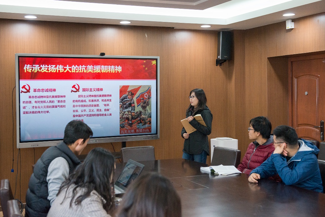 本次会议学习部分分为“微讲堂”和“微建设”两部分。首先,王心蕊同志以“抗美援朝·英雄精神”为主题进行“微讲堂”分享,全体支部成员共同学习了习近平总书记在纪念中国人民志愿军抗美援朝出国作战70周年大会上发表的重要讲话。习总书记指出:“伟大抗美援朝精神跨越时空、历久弥新,必须永续传承、世代发扬。”人民志愿军在抗美援朝战争中表现出的不畏艰险、不惧牺牲、勇于奉献的精神以及祖国和人民利益高于一切的坚定信念永久地书写在了中华民族光辉的史册中。与会支部成员表示要学习革命先辈的英勇,永远牢记和平来之不易,应当珍惜当下,传承和弘扬抗美援朝伟大精神,牢记历史使命,继续在伟大的复兴之路上砥砺前行。