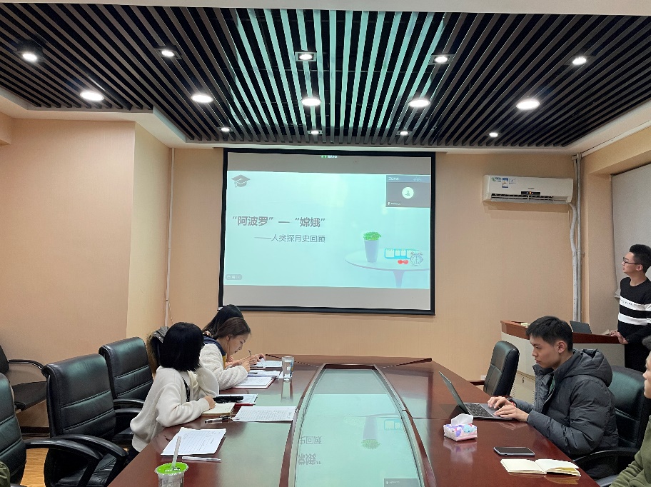 接下来开始党支部12月组织生活,首先由曹镓玺同志为我们带来题为《“阿波罗-嫦娥”人类探月史回顾》的会前学习,结合我国最近执行的探月工程嫦娥五号任务,带我们回顾了探月史,分析了人类为什么要探索月球以及探月能为人类带来什么,内容生动有趣。