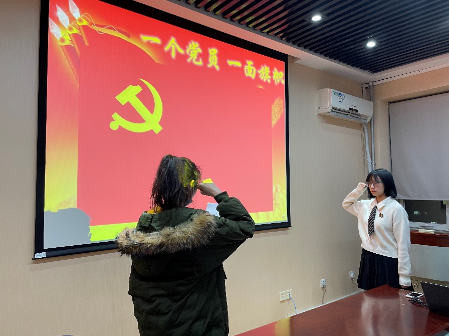 会议伊始,支部书记陈禹含同志宣读了《中国共产党发展党员工作细则》相关内容,确认本次大会严格按照标准程序进行。首先,发展对象刘莹同志宣读了入党申请书,汇报了自己的入党动机、理论学习经历,表达了对加入中国共产党,成为共产党员的强烈愿望。刘莹同志的入党介绍人代明哲同志和解璐萌同志对其进行了全面评价,均认为发展对象思想积极进步,政治立场坚定,在校期间各方面表现优秀,有良好的群众基础及榜样示范作用,具备党员条件,愿意推荐其加入中国共产党。经过支部全体正式党员无记名投票表决,与会党员全票通过,同意刘莹同志加入中国共产党。刘莹同志在党旗前进行了庄严的入党宣誓,并表示今后将继续接受党组织的考验,努力学习理论知识,以实际行动践行对党的承诺。