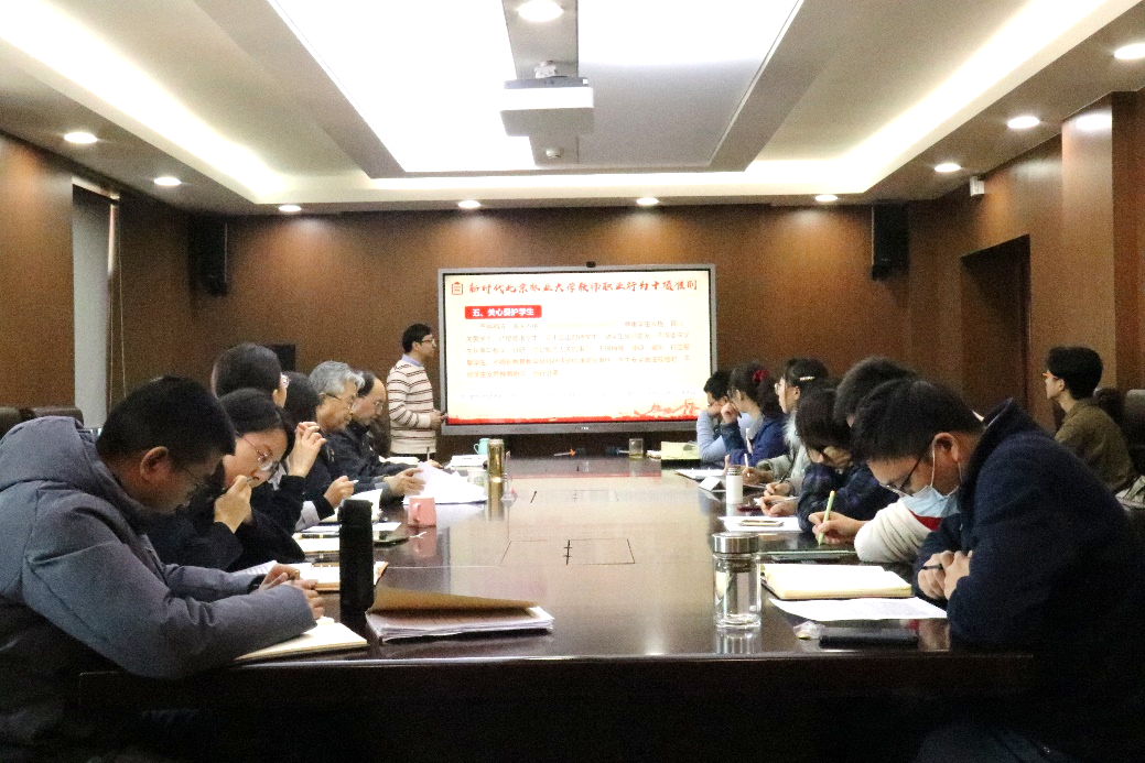 院党委书记任忠诚在会上表示,师德师风建设,对于全面提高教育质量、办人民满意的教育,具有十分重要的意义。学院要继续开展警示教育,同时树立教师典范,不断提高教师队伍职业道德素养,落实立德树人根本任务。支部书记高俊琴传达了《124日教育部全国高校师德师风建设工作经验交流视频会议》精神,会议要求要推动高校教师师德师风建设高质量发展,打造高素质专业化创新型教师, 需聚焦“两个大局”、“三个关键点”、“三个制高点”,补齐短板,进一步加强领导。
