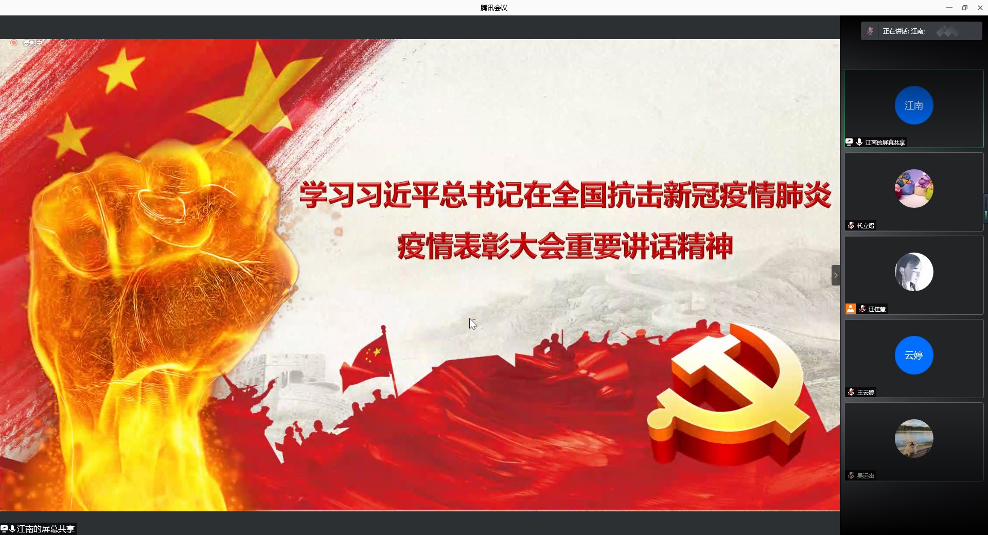 会前学习环节,尹江南同志带领大家学习习近平总书记在全国抗击新冠肺炎疫情表彰大会的重要讲话,深刻领会了生命至上、举国同心、舍生忘死、尊重科学、命运与共的伟大抗疫精神,传递了自己“山河犹在 国泰民安”的美好愿景;刘栋同志从疫情现状和抗疫英雄故事的角度,诠释强大的中国力量以及中华民族不畏艰险、百折不挠的奋斗精神,并号召我们向英雄们学习。