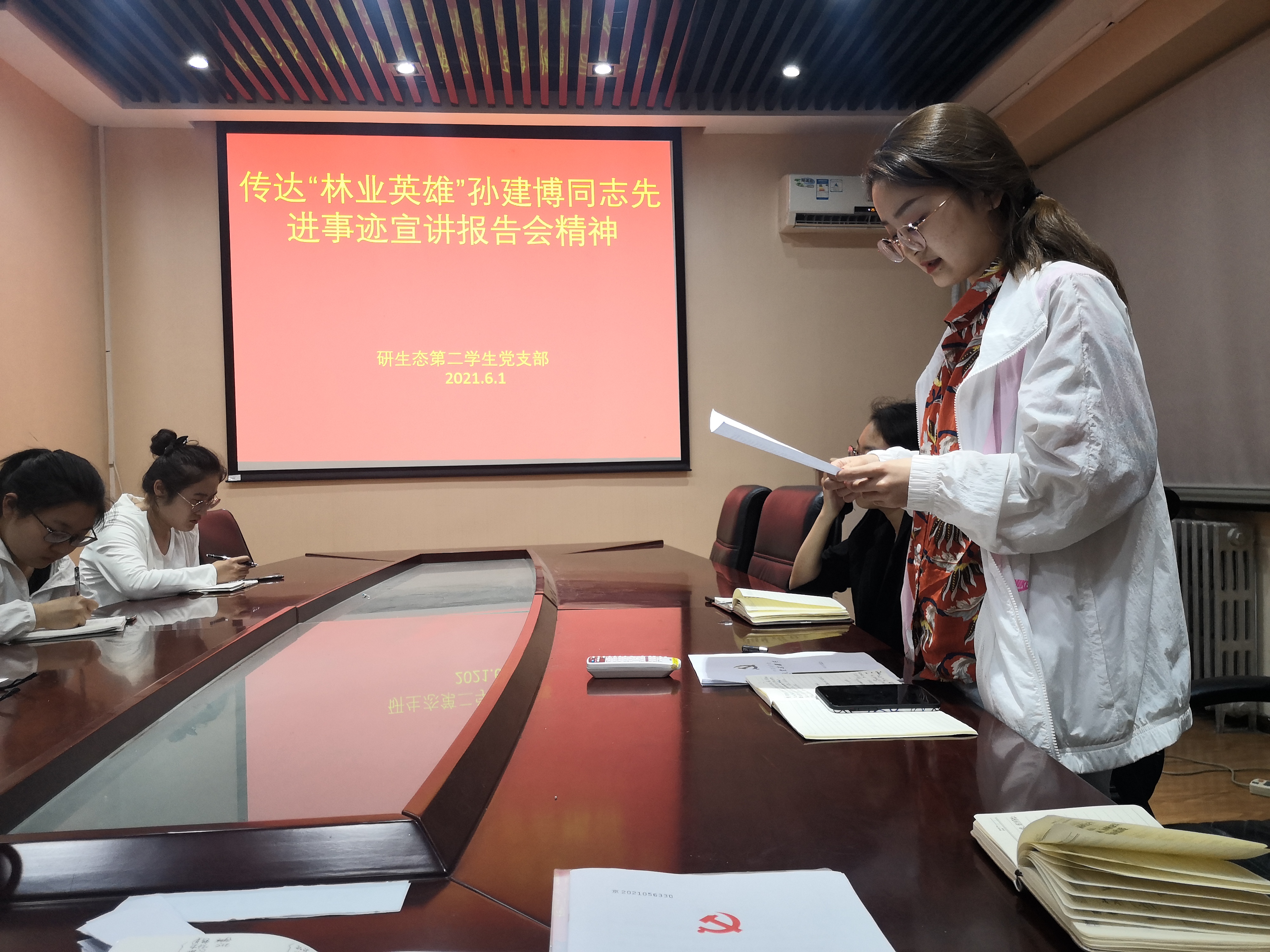 会议伊始,发展对象陈思帆首先向大家传达了“林业英雄”孙建博同志先进事迹宣讲报告会精神。孙建博讲述了原山人在党的坚强领导下不忘初心、牢记使命,用担当作为实现从荒山秃岭到绿水青山再到金山银山的历史转变。孙建博的先进事迹感人肺腑、催人奋进,他带领原山职工艰苦奋斗、无私奉献的精神令人敬佩,深受鼓舞。