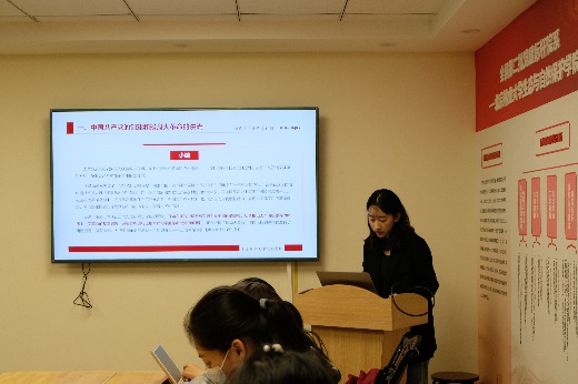 会议第二项是由第三党小组成员杨楠和王琦雅同志进行微党课学习。两位同志皆选取了中国共产党党史中的某一历史时期带领大家进行了解和学习。杨楠同志讲述了新民主主义革命时期中国共产党的发展历程,通过“五四运动”、“中共一大”、“南昌起义”、“长征”、“西安事变”等具体历史事件向大家梳理了这一时期党的发展过程;王琦雅同志展示了社会主义革命与建设时期的曲折与成就,从社会主义制度的基本确立与社会主义建设和探索的曲折发展两个时间段来切入,阐述了中国共产党在建国初期对社会主义制度的探索。