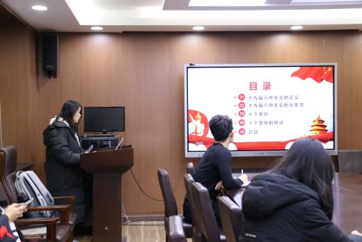 会议第二项是微党课学习。李誓缘同志以“学习十九届六中全会重要意义”为主题,带领大家一起学习了十九届六中全会的主要内容,包括十九届六中全会的主要议程、百年历程四方面伟大成就、百年奋斗四方面重大改变、总结经验三方面的意义、回答两个重要问题等内容;冯与笑同志为大家讲解了十九届六中全会的十个坚持,表示应当积极响应党中央的号召,全面贯彻习近平新时代中国特色社会主义思想,大力弘扬伟大建党精神,勿忘昨天的苦难辉煌,无愧今天的使命担当,不负明天的伟大梦想,以史为鉴、开创未来,埋头苦干、勇毅前行,为实现第二个百年奋斗目标、实现中华民族伟大复兴的中国梦而不懈奋斗。朱颖璨同志和王映霓同志分别正确回答了李誓缘同志和冯与笑同志针对讲解内容提出的问题,大家也对两位同学的微党课内容进行了讨论。