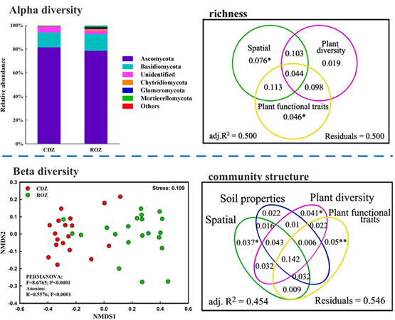 课题组还就绿洲与毗邻荒漠进行配对对比,探讨植物物种多样性、功能性状与土壤微生物多样性的内在关联性,结果表明,荒漠与绿洲土壤真菌主要类群在门和属水平上均存在显著差异,植物功能性状与空间变量共同驱动着土壤真菌alphabeta多样性。