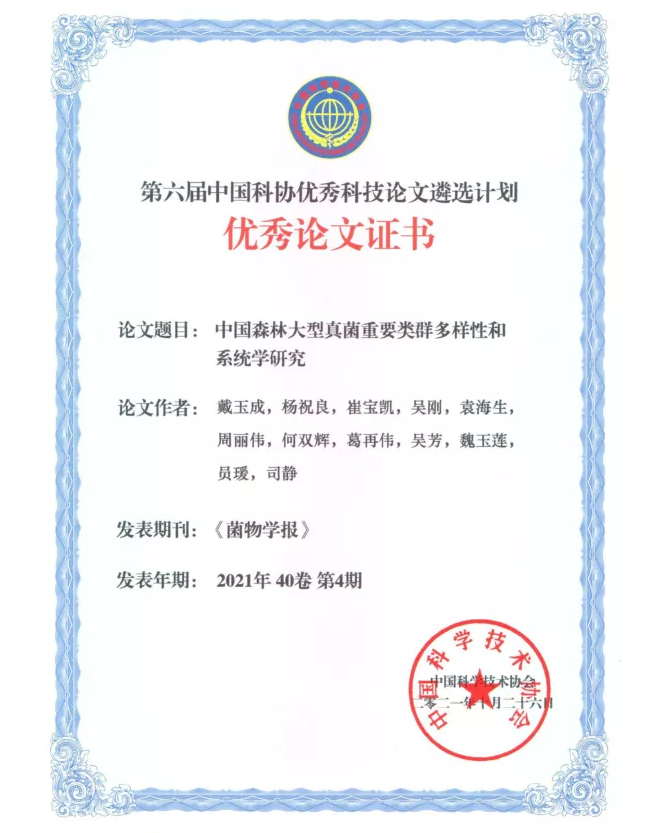 近日,中国科协公布了第六届优秀科技论文遴选计划的入选论文名单,我院微生物生态学科戴玉成教授和中科院昆明植物所杨祝良研究员等人发表在我国科技期刊《菌物学报》的论文:“中国森林大型真菌重要类群多样性和系统学研究”入选为优秀科技论文。