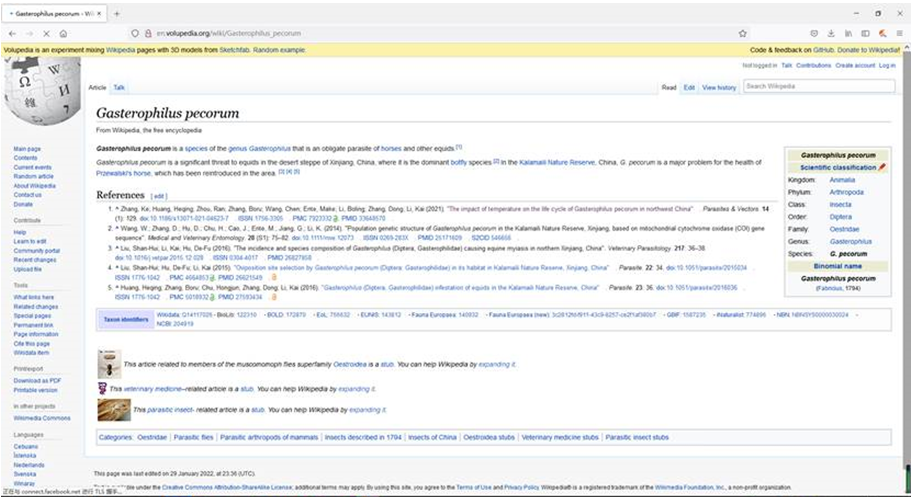 我院李凯教授团队20年从事放归普氏野马健康状态监测工作,2021年在TOP期刊《Parasites & Vectors》发表的论文“The impact of temperature on the life cycle of Gasterophilus pecorum (黑腹胃蝇) in northwest China”被《维基百科》又一次引用在“黑腹胃蝇”物种的介绍中*1