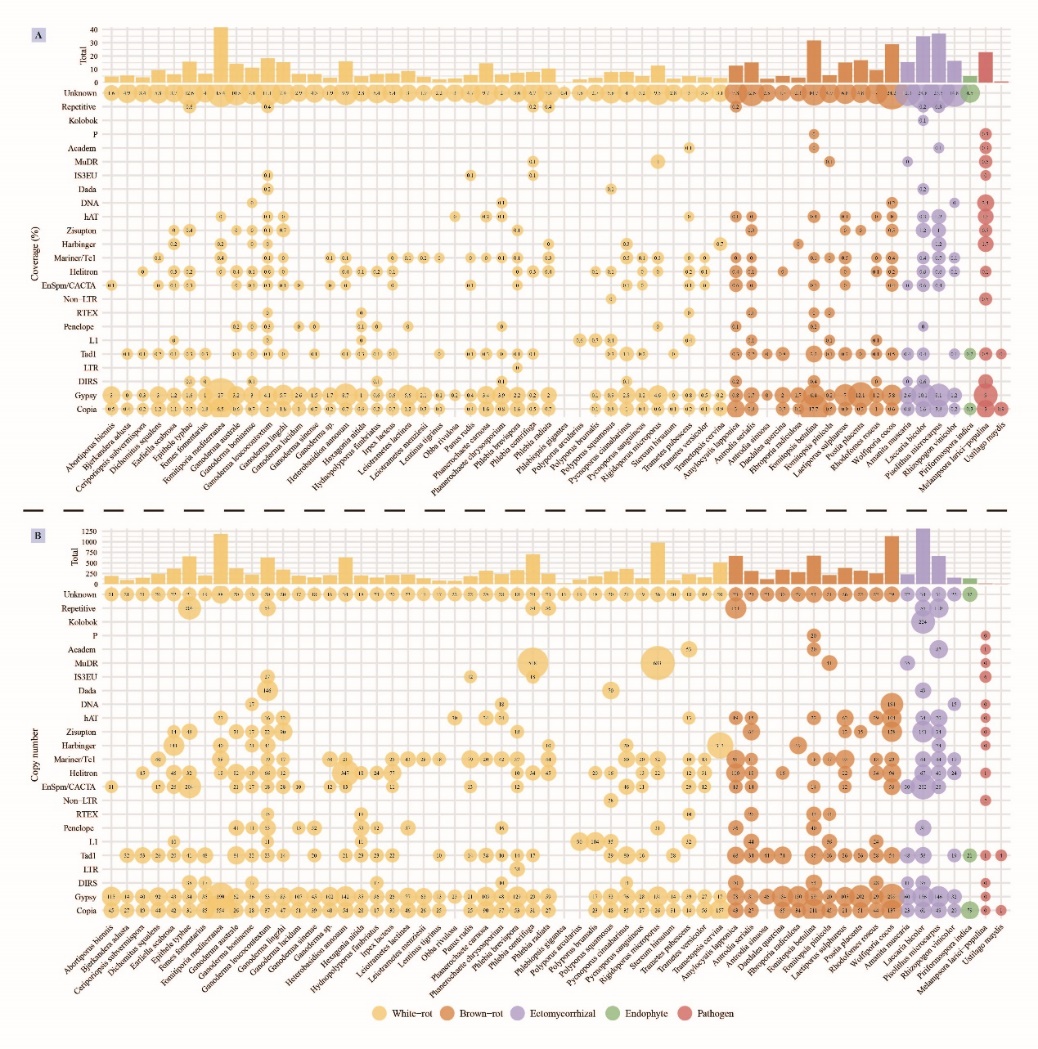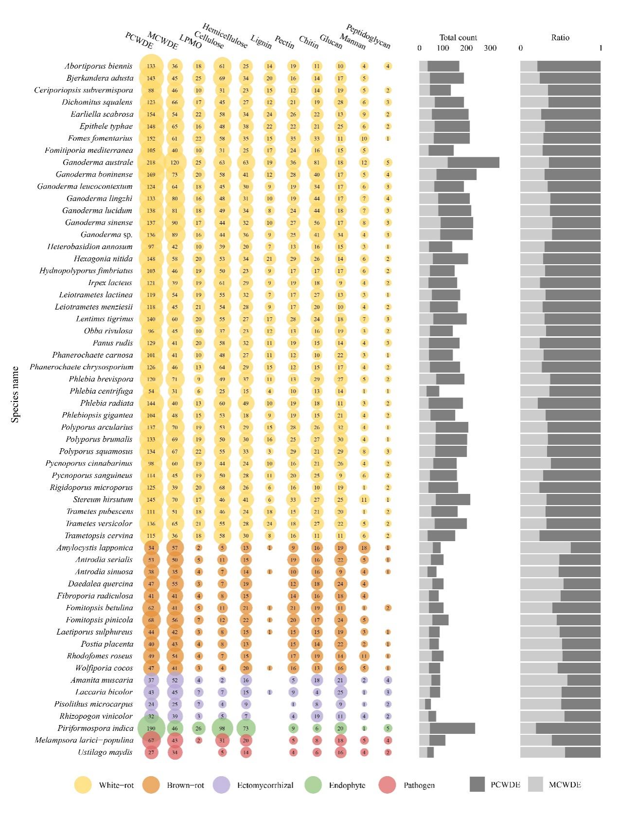 灵芝属是灵芝科中最大也是经济价值最为重要的一个属,包括了460个分类单元和181个确认的物种。然而,过去只有6个灵芝属物种的完整基因组被测序并报道。崔宝凯教授团队与法国农科院Francis M. Martin院士团队合作,基于二代Illumina和三代PacBio测序平台,对灵芝属3个物种:灵芝Ganoderma lingzhi、南方灵芝Ganoderma australe、白肉灵芝Ganoderma leucocontextum进行了全基因组测序,筛选了具有不同生态习性的白腐真菌、褐腐真菌、外生菌根菌、内生菌根菌和病原菌等共58种真菌,通过系统发育基因组学和比较基因组学分析,比较了灵芝与其它真菌在基因组大小、转座子构成、次级代谢产物合成和木质纤维素降解等方面的差异,对灵芝属真菌的起源演化过程、潜在药用价值和木质纤维素降解能力进行了预测,重点分析了与细胞色素P450s相关的蛋白结构域和与次生代谢和木质纤维素降解相关的编码基因,结果发现:1) 3种灵芝的基因组大小为60.34 ~ 84.27 Mb,编码15007 ~ 20460个基因,灵芝属真菌基因组大小整体高于其他白腐真菌,不同生活方式与真菌基因组大小之间无直接联系;2) 58种真菌的143个单拷贝基因进行了系统发育基因组学分析,证实了灵芝属真菌属于核心多孔菌分支;3)与其他真菌相比,灵芝属物种的基因组编码了更多的萜类代谢和分泌蛋白 (CAZymes、脂肪酶、蛋白酶和SSPs) 相关的基因;4) 南方灵芝 G. australe 是现有灵芝属真菌中基因组最大 (84.27 Mb) 和预测基因数量最多的 (20460),拥有丰富的与萜类物质合成相关的基因簇,具有更多的与细胞色素P450s、异核不亲和性hetMFS膜转运蛋白调节因子相关的蛋白结构域,编码了更多的参与降解植物细胞壁、微生物细胞壁、果胶、肽聚糖和几丁质的碳水化合物水解酶基因,揭示了南方灵芝G. australe可能具有更强的次级代谢产物合成和木质纤维素降解能力。研究结果丰富了灵芝属真菌的全基因组序列信息,阐明了3种灵芝的遗传特征、进化关系及潜在功能价值,为今后进一步开展灵芝属真菌的药用价值和生态功能研究奠定了一定的基础。相关研究成果以“Phylogenomics and comparative genomics highlight specific genetic features in Ganoderma species为题,2022年发表在生物学二区期刊Journal of FungiIF=5.724)。博士生孙一翡为第一作者,崔宝凯教授和Francis M. Martin院士为共同通讯作者。该研究得到了国家自然科学基金、新疆生产建设兵团重点领域科技攻关课题、北京林业大学杰出青年人才培育项目等资助。