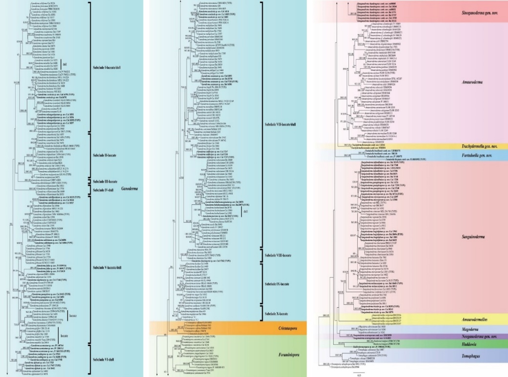 崔宝凯教授团队与巴西、澳大利亚、捷克等国家和国内其他单位的同行专家合作,收集了世界范围内的灵芝科真菌标本,并分离保存了大量野生灵芝菌种的种质资源,在此基础上,基于形态学和多基因序列(ITSnLSUrpb2tef1mtSSUnSSU)对世界范围内的灵芝科真菌物种进行了多样性和系统学研究,并重点对中国的灵芝科真菌种类进行了分析。建立了NeoganodermaSinoganodermaFurtadoellaTrachydermella4个新属,描述了Ganoderma acaciicolaG. acontextumG. alpinum23个新种;对世界范围内报道的灵芝科真菌所有物种的分类地位进行了总结分析,确认了灵芝科目前包含14个属278个物种,其中中国分布有59种;对GenBank中灵芝科真菌的物种序列进行了筛选,比较了不同基因在灵芝科真菌物种鉴定与系统发育分析中的实用性与可靠性,提供了目前具有分子序列的145个物种的可靠序列信息,明确了灵芝科真菌不同属间的亲缘关系。研究结果提高了世界范围内灵芝科真菌的物种多样性的认识,更新了灵芝科真菌的分类体系,为今后开展灵芝科真菌野生种质资源的保护、开发与利用提供了基础,目前团队已完成了几种野生灵芝的人工驯化栽培工作。相关研究成果以“Species diversity, systematic revision and molecular phylogeny of Ganodermataceae (Polyporales, Basidiomycota) with an emphasis on Chinese collections”为题,2022年发表在生物学一区Top期刊Studies in MycologyIF=25.731)。博士生孙一翡和邢佳慧(目前在广东省科学院微生物研究所工作)为共同第一作者,崔宝凯教授为通讯作者。该研究得到了国家自然科学基金、新疆生产建设兵团重点领域科技攻关课题和北京林业大学杰出青年人才培育项目的资助。