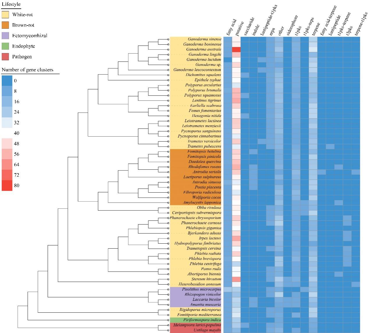 5 CAZymes注释基因在灵芝属和其它真菌中的分布