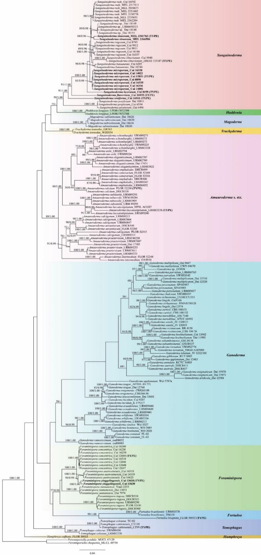 假芝属真菌是灵芝科中的第二大类群,主要分布于亚洲、非洲、美洲、大洋洲的热带和亚热带地区,崔宝凯教授团队与巴西、澳大利亚等国家和国内其他单位的同行专家合作,基于形态学和多基因序列(ITSnLSUrpb1rpb2tef1TUB)对假芝属真菌进行了多样性和系统发育研究,建立了1新属:血芝属Sanguinoderma,发表了Sanguinoderma flavovirensS. microporum6个新种和8个新组合种;发现假芝属(假芝类)是多系起源的,将广义的假芝属划分为4个支系:Amauroderma s. str. CladeForaminispora cladeFurtadoa cladeSanguinoderma clade,明确了假芝类真菌不同属间的亲缘关系,更新了假芝类真菌的分类体系,为开展灵芝科真菌的系统学研究提供了基础。相关研究成果以“Multi-gene phylogeny and taxonomy of Amauroderma s. lat. (Ganodermataceae)”为题,2020年发表在生物学一区Top期刊PersooniaIF=11.051)。博士生孙一翡为第一作者,崔宝凯教授为通讯作者。该研究得到了国家自然科学基金、生态环境部生物多样性调查与评估项目和中央高校基本科研业务费等项目的资助。