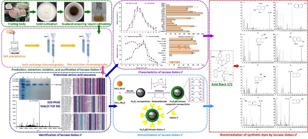 灵芝属真菌均是白腐真菌,能够产生漆酶,是重要的生物资源,在工业生产、生物降解与环境保护等领域具有广泛的应用价值。崔宝凯教授团队从野外分离获得的50株灵芝菌株中筛选出一株高产漆酶菌株:南方灵芝Dai 11646,经盐析、离子交换和分子筛纯化从中获得一种新的漆酶:Galacc-F,该漆酶是一种分子量为48.0kDa的单体蛋白,广泛的pH5.0−8.0)和温度(10−60 ℃)范围内展现出较高的活性和稳定性,且具有广泛的底物专一性。Galacc-F是一种稀有的金属蛋白酶,含有典型的组氨酸-半胱氨酸-丝氨酸催化三联体,同时对表面活性剂、氧化剂和盐具有较强的耐受性。利用戊二醛作为交联剂将天然Galacc-F固定于Fe3O4@Chitosan复合纳米颗粒,得到的固定化漆酶在催化效率方面显著提高,可用于纺织染料废水的生物降解。南方灵芝漆酶Galacc-F因其出色的稳定性和耐受性有望成为有前景的绿色催化剂,可应用于合成染料废水的生物修复等环境保护领域。相关研究成果以“Selection of a pH- and temperature-stable laccase from Ganoderma australe and its application for bioremediation of textile dyes为题,2021年发表在环境科学与生态学二区Top期刊Journal of Environmental ManagementIF=8.91)。司静副教授为第一作者,硕士生吴怡(现在中国农业大学工作)完成了其中的部分研究工作,崔宝凯教授为通讯作者。该研究得到了国家自然科学基金、北京林业大学杰出青年人才培育项目的资助。