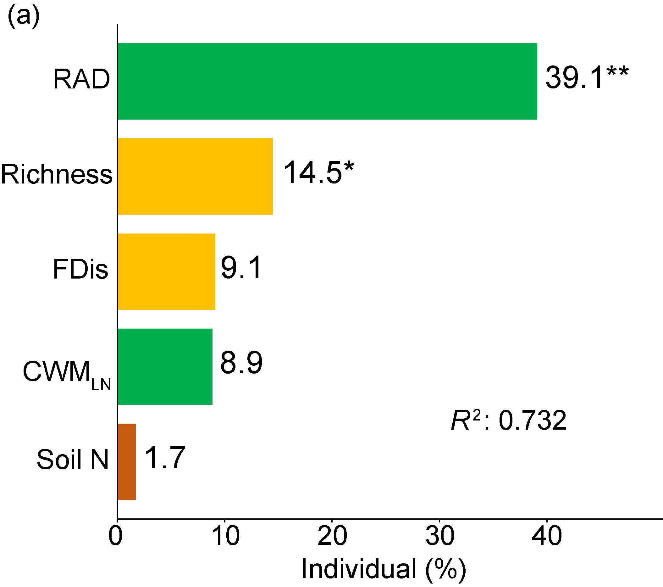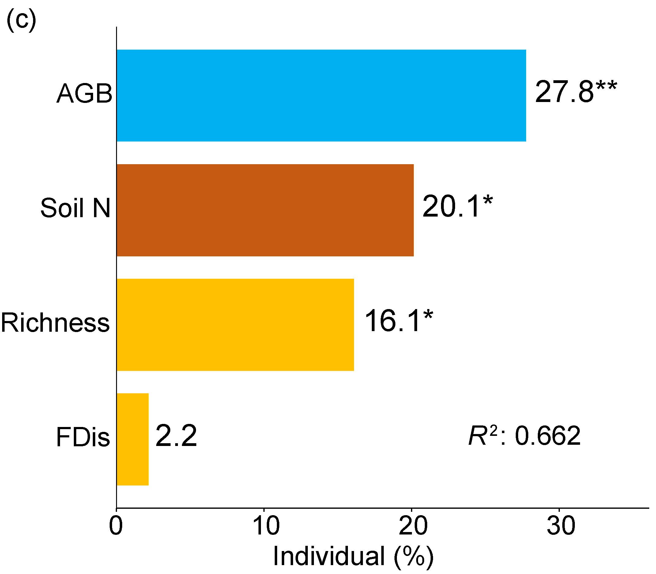 另外,我们还评估了多样性和这些因素的相对强弱。如果类似于以往研究,在多元分析中不考虑细根生产力和生物量间的相关生长关系,我们发现这可能会高估互补效应对细根生产力的影响(图4)。因此,我们建议应深入研究异速生长关系,以更好地了解互补与质量比效应、林分因素和环境如何共同影响细根动态。