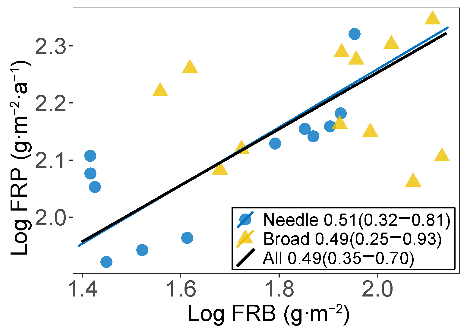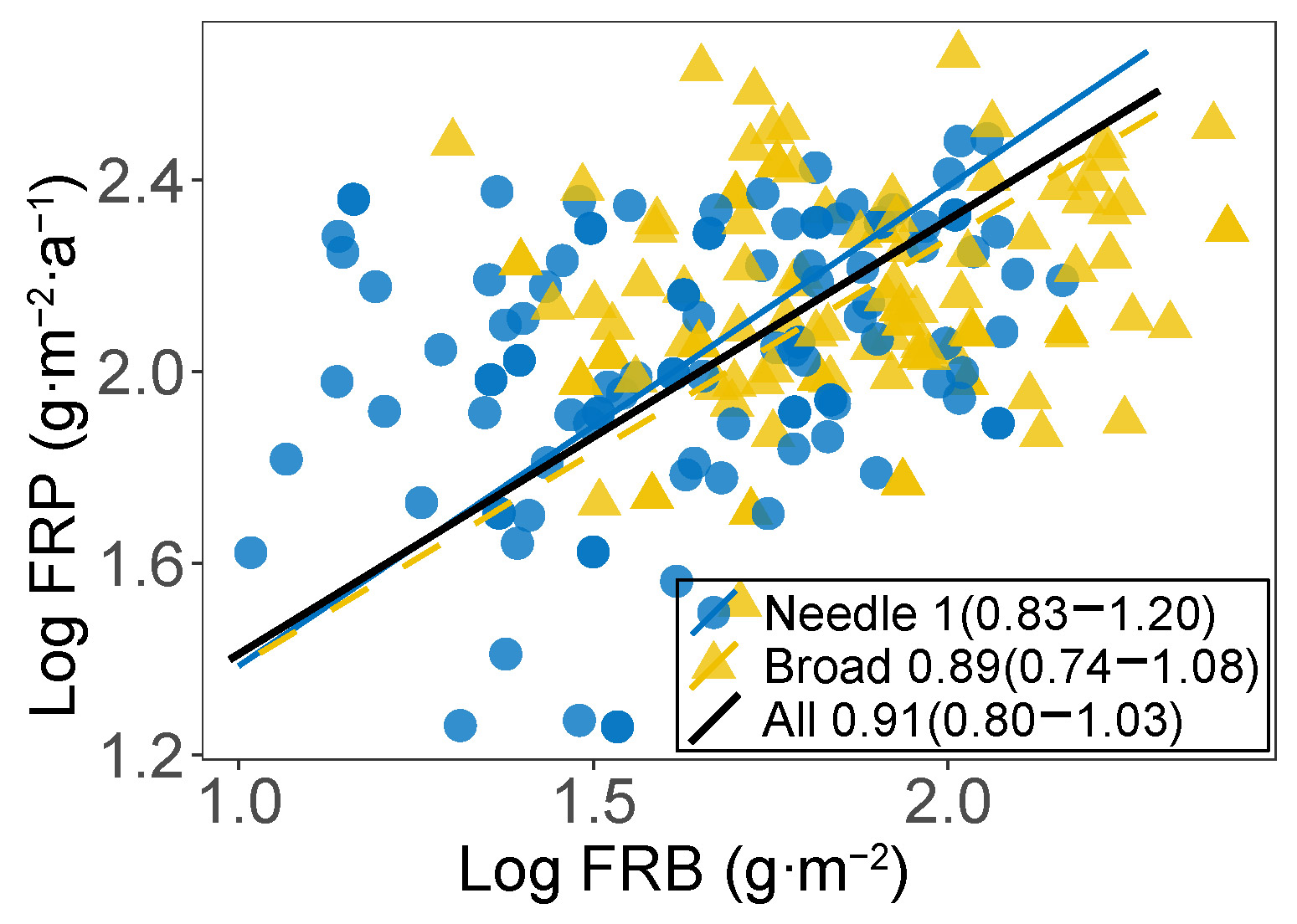 研究结果表明,无论是在土芯水平还是样地水平,FRP与FRB均存在稳定的相关生长关系,且前者支持了代谢相关生长理论(MST)对于叶片的预测 (幂指数= 1)(图1)。