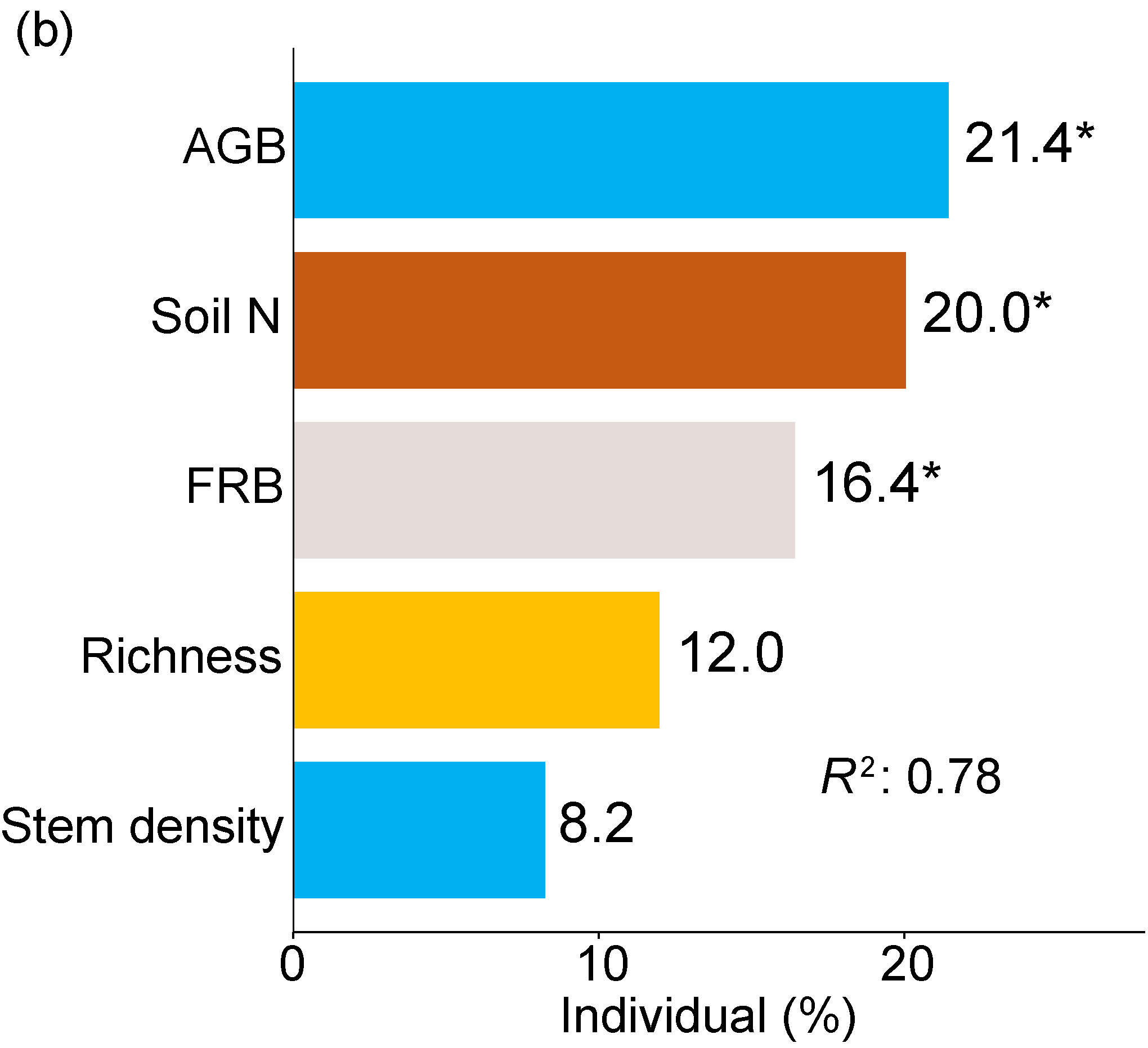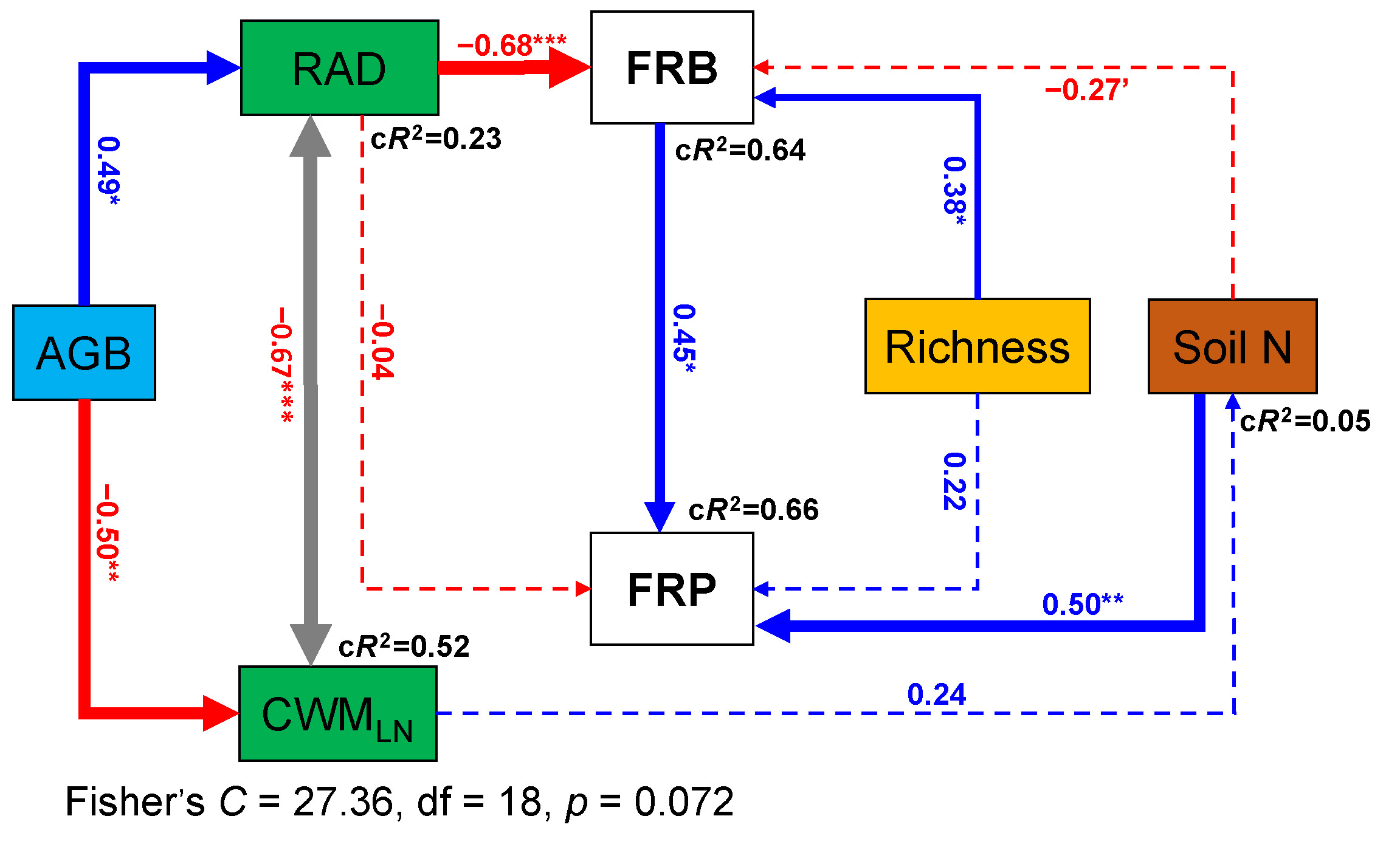 相反,我们发现,较高的AGB导致更保守的树木生长策略(叶和细根),从而导致较低的FRB,进而又通过异速生长限制降低了FRP(图3)。
