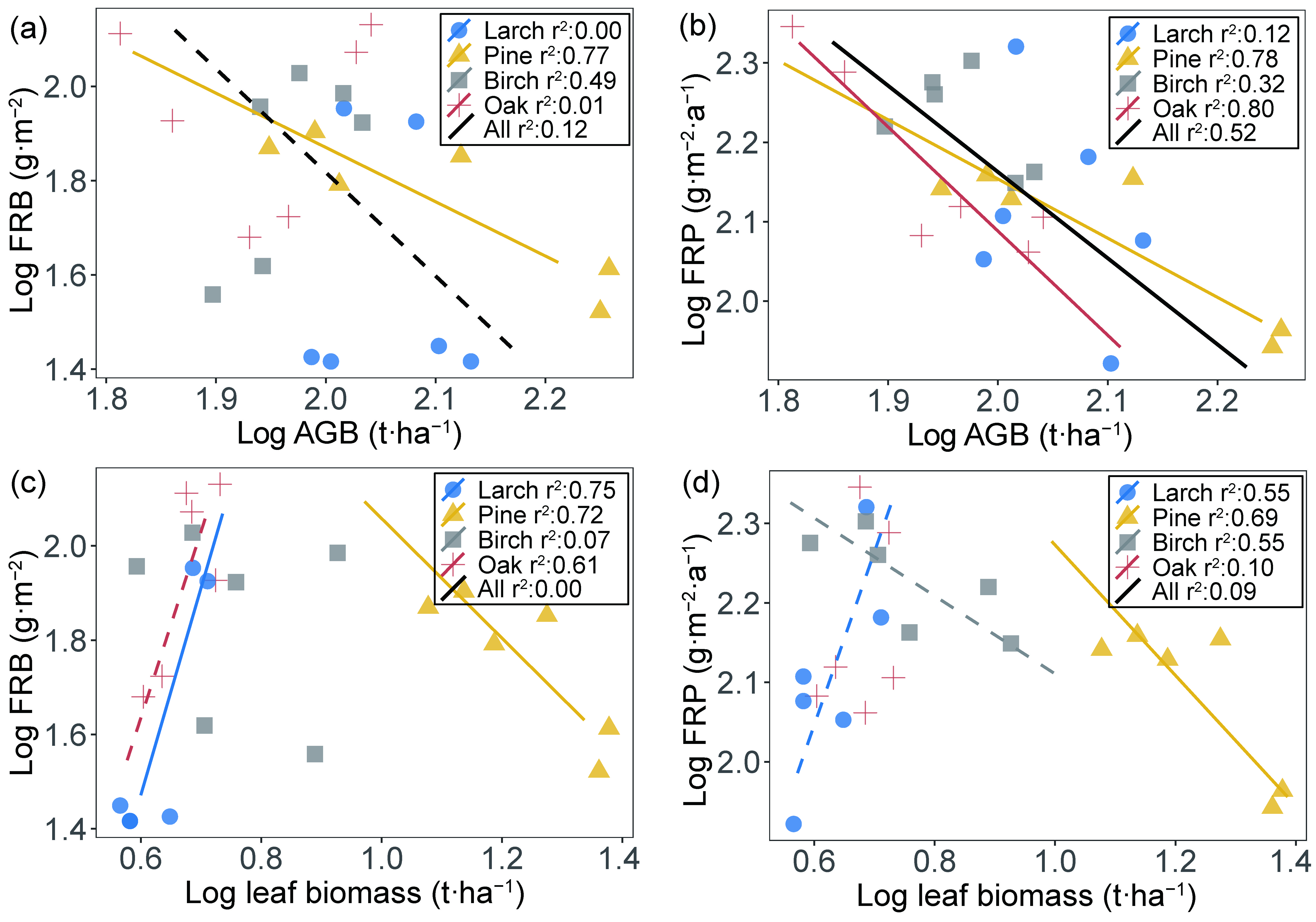 为此, 我们利用中国华北地区暖温带山地4种典型林分(桦木林、栎林、落叶松和松林)的216个土芯(内生长芯),对24个样地的FRB 和FRP进行了估计,并测定了林分因子、多样性、土壤特性以及功能性状(叶、茎和细根)。研究检验了FRB、FRP、地上生物量(AGB)、叶片生物量和功能性状之间的相关生长关系,并分析了相关生长、依赖大小的生长策略、质量比和互补效应对FRB和FRP的直接和间接影响。