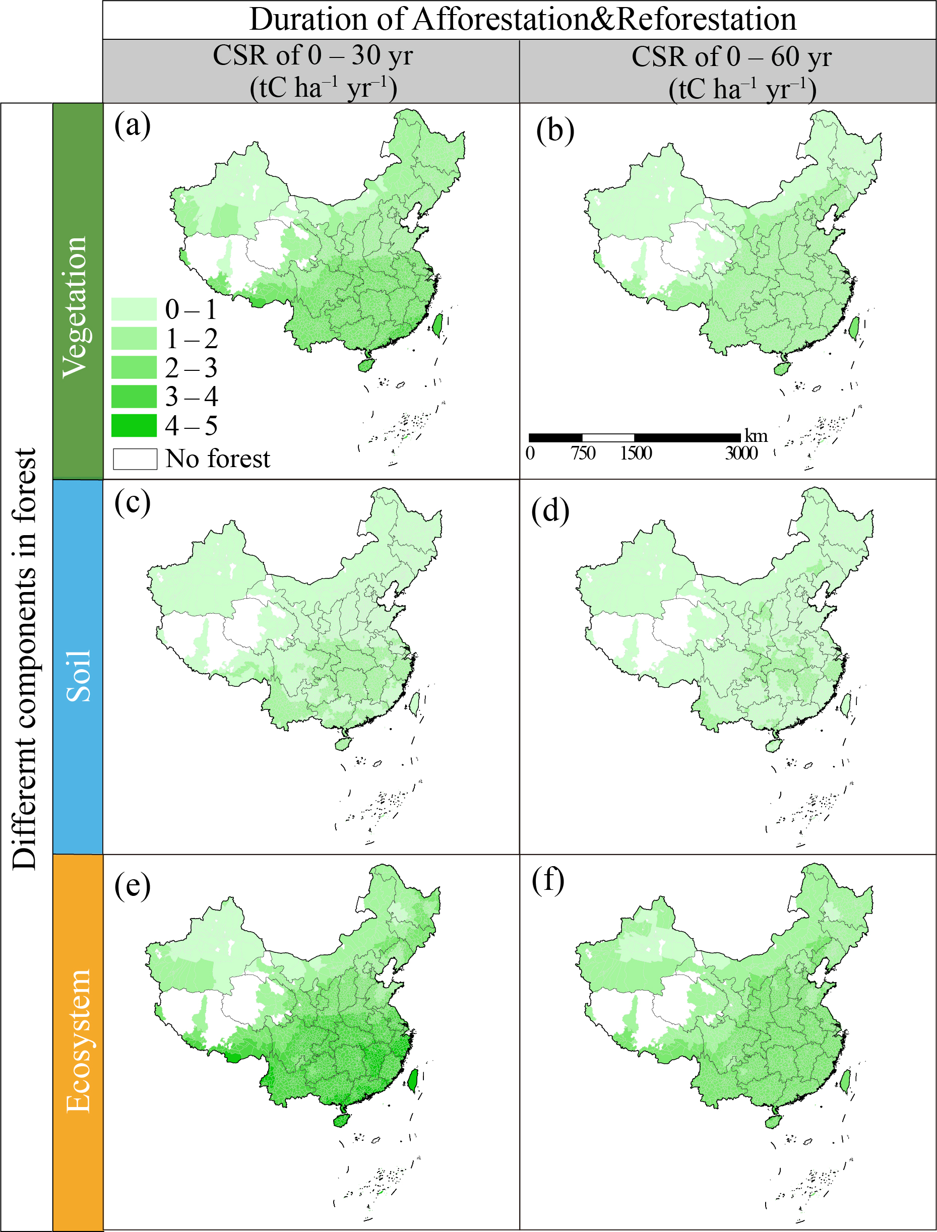 此外,我们还生产了造林区划图(图3)和一套计算造林/再造林碳汇的关键参数(单位面积、单位年的固碳速率,tC ha–1 yr–1),可以快速计算不同尺度(省、市、县)造林/再造林后森林生态系统不同组分的固碳潜力。旨在通过优化后的造林/再造林固碳速率分布图和关键参数为中国造林/再造林规划提供参考,为区域碳贸易和碳补偿提供依据(图4)。