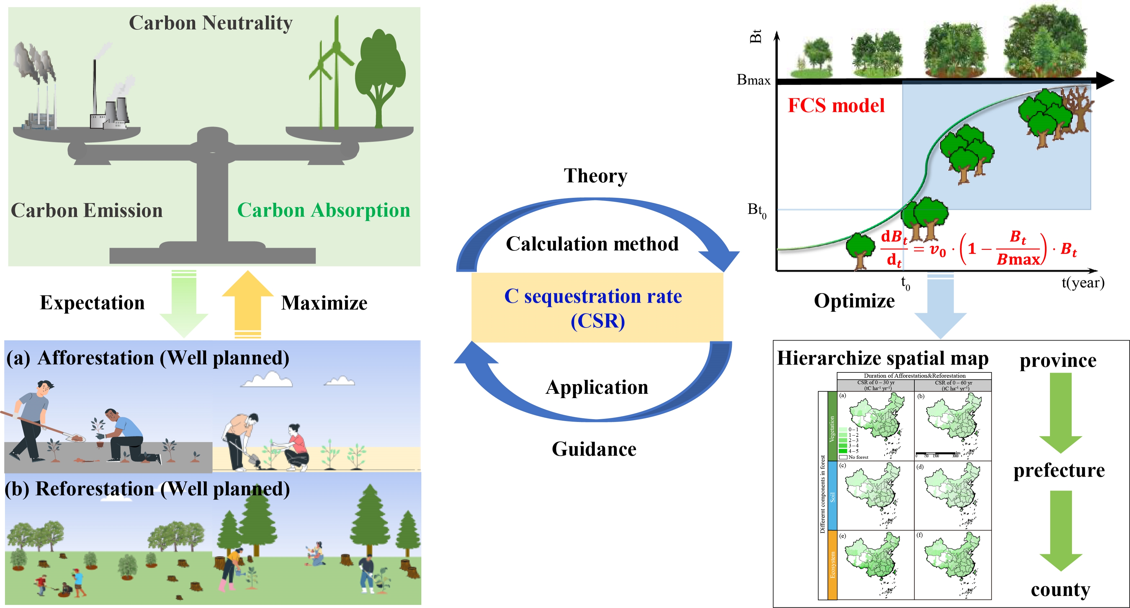 然而,随着造林适宜区域逐渐减少,未来如何进行造林或再造林规划,成了管理人员和科研人员的重大困扰。近年来,科学家试图从温度和降水对森林生存的影响方面确定适合造林区域,但目前关于其森林碳汇,特别是土壤碳汇信息非常罕见。在哪里造林或再造林最有效地提高生态系统碳汇,还是一个巨大的科学挑战。因此,迫切需要考虑植被、土壤和生态系统的造林或再造林固碳速率空间图,为决策者在国土空间统筹下进行科学指导,最大限度地提高造林或再造林的固碳能力,更好服务于国家碳中和战略目标(图1)。