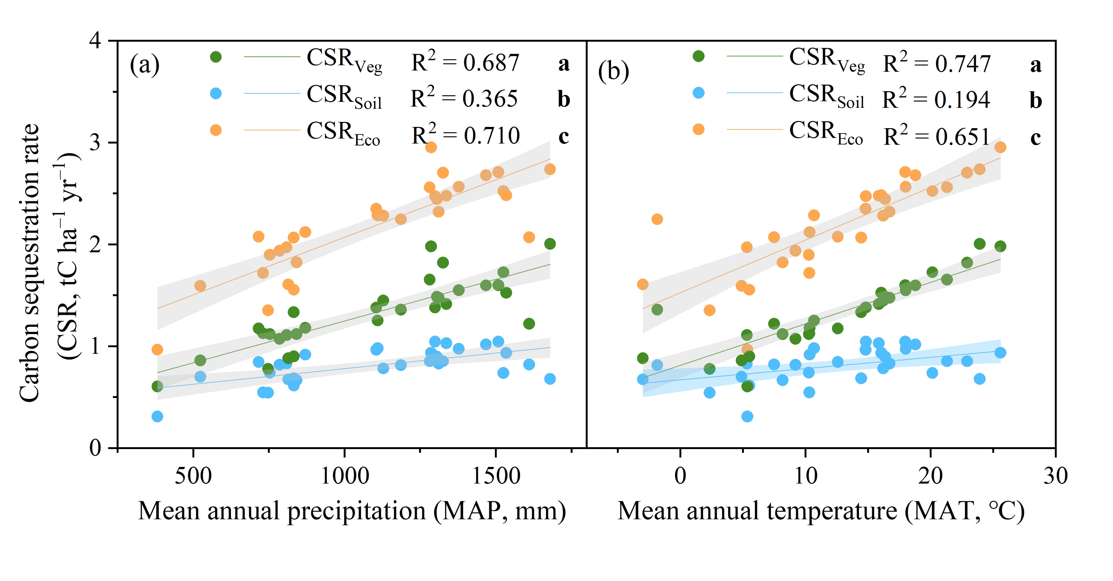 研究结果表明:不同森林成分的固碳速率随着MAPMAT的增加而明显增加,但土壤和植被的固碳速率对气候因素变化的反应明显不同(图2)。结构方程模型的结果显示,土壤、植被和生态系统固碳速率的变化主要由MATMAP和土壤氮含量解释。值得注意的是,植被和土壤的固碳速率受MAT影响的效应不同,说明森林生态系统固碳速率不能由传统的植被固碳速率来代表,未来应综合考虑植被和土壤的影响。