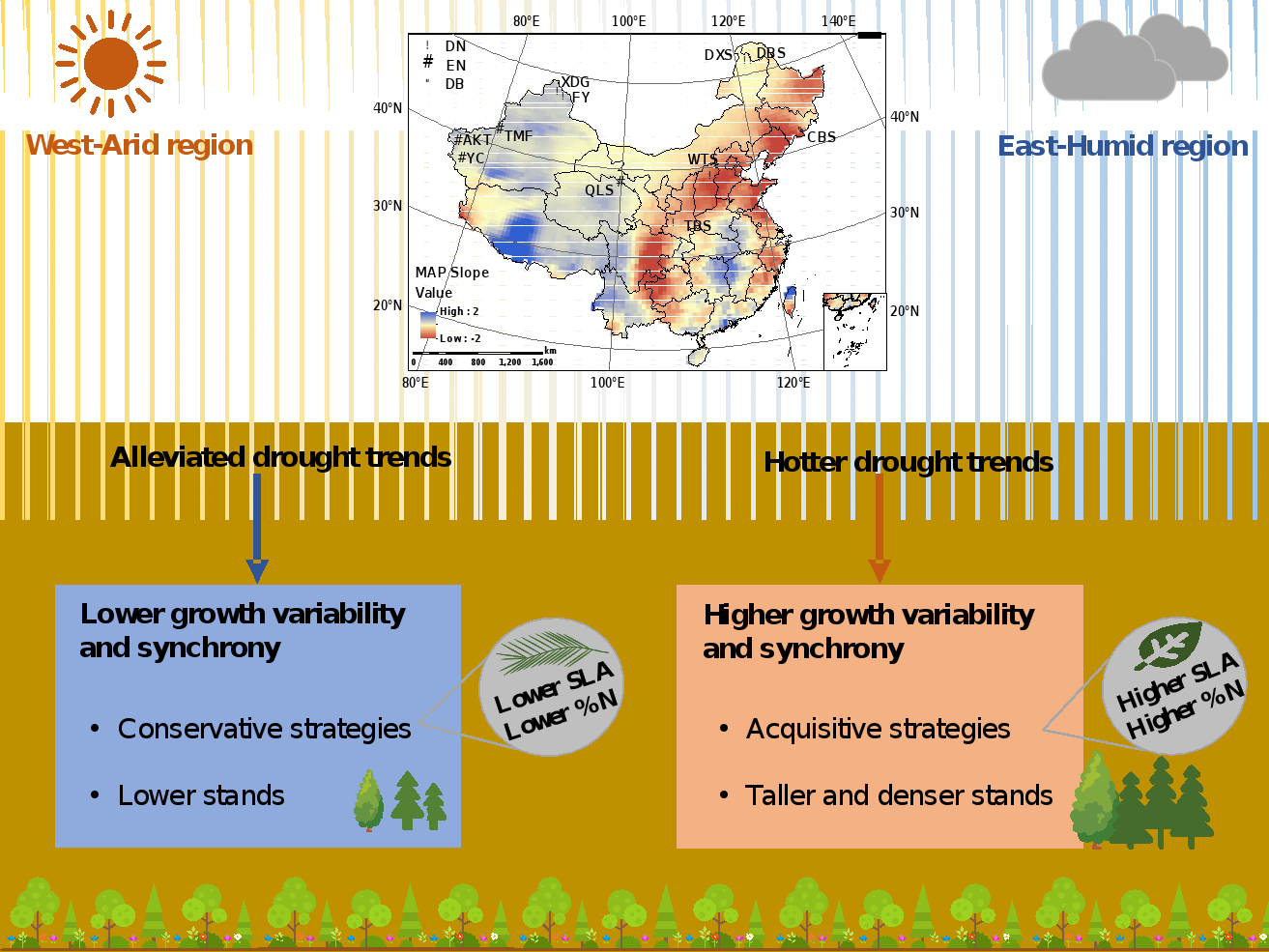 以往一般认为北极(高山)林线的形成是由于生长季温度的限制所导致,因此全球变暖可能有利于高纬度(海拔)树木的生长。但近期研究发现,干暖化正在取代温度成为高纬度(海拔)地区树木生长的主要限制因素,并威胁森林生态系统的稳定。生长的时间变异性、空间同步性(树木间的年轮宽度一致变化的程度),对于理解气候变化下森林生态系统服务的功能和维持至关重要。目前,不同自然地理区域的气候变化差异,如何与功能性状、林分结构共同作用于树木生长的时空变异性的大尺度地理格局, 其驱动机制仍不清楚。