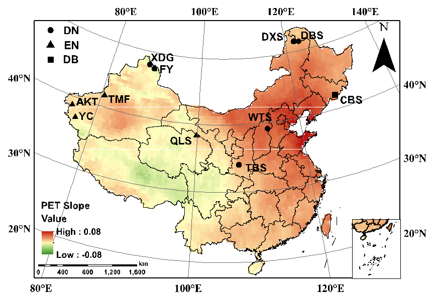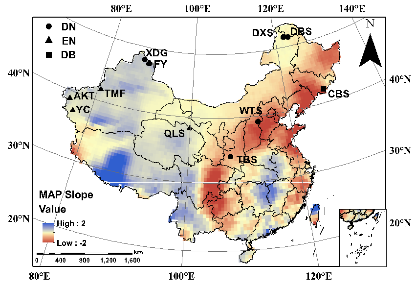 1 中国北方11个高山林线采样点的位置。背景图显示了1950-2005年间的年平均降水量的斜率()以及年平均潜在蒸散量的斜率()。其中,DN是落叶针叶林; EN是常绿针叶林; DB是落叶阔叶林。
