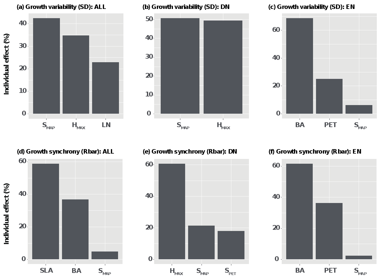 4混合效应模型中(地点”作为随机效应)解释树木生长的时间变异性(SD)和空间同步性(Rbar)的各变量的相对重要性