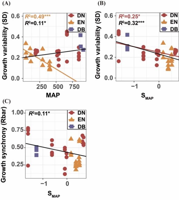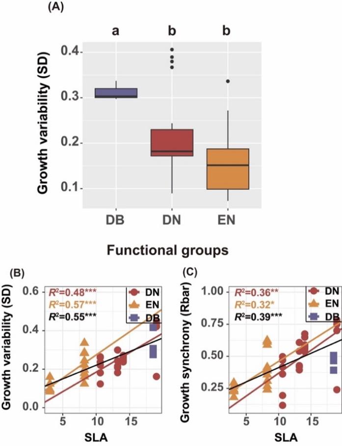 我们还发现了不同功能型的生长变异性存在显著差异,落叶阔叶林最大,其次是落叶针叶林,而常绿针叶林最小(图3A);并且快速生长策略(高比叶面积)的树种有更大的生长时空变异性(图3B, C)。这与我们在全球尺度上的结果相反(Wang & Wang, 2024), 可能是由于东部林线地点的树种具有快速生长策略、但经历了明显的干暖化,后者直接导致了更大的生长变异性。