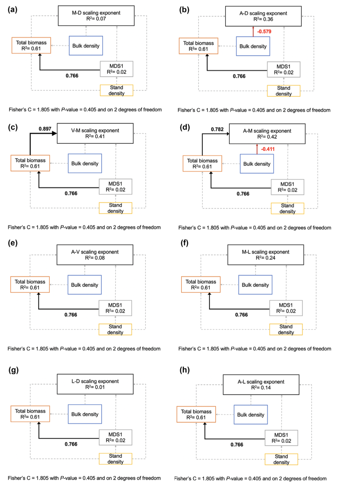 其中一些相关生长幂指数主要受树木大小或土壤肥力的直接影响,而物种组成仅通过树木大小起到间接的影响(图2,图3)。