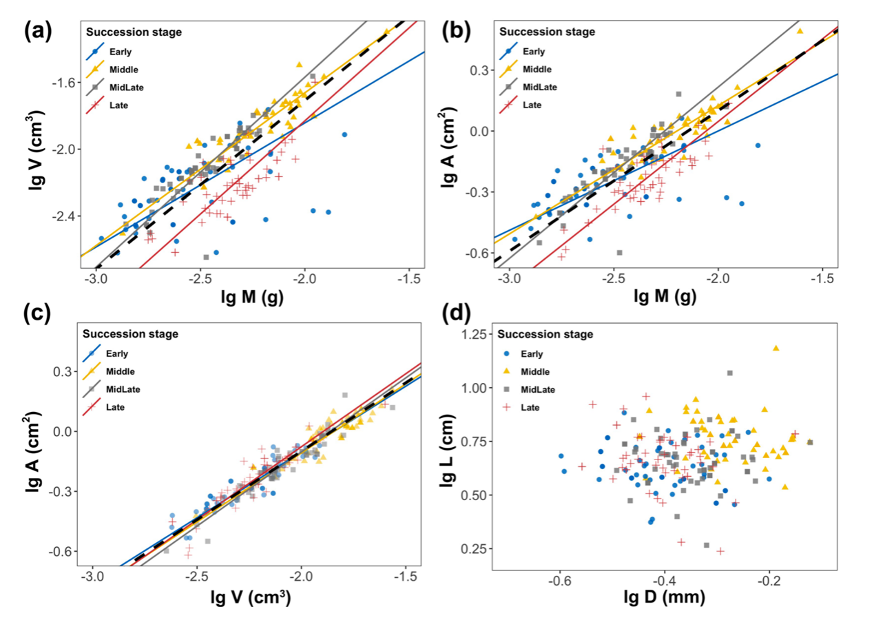 为此,我们在西双版纳热带雨林的演替序列样地中,对直径<1mm<>的细根进行了取样,测量了来自216土芯中个体根段的质量(M)、表面积(A)、体积(V)、直径(D)和长度(L)等性状,探究了其中8个相关生长关系。本研究检验了细根形态性状间相关生长是否符合 MST 关于叶片的模型(MSTl) 或树枝树干等木质器官的模型预测(MSTw)。探究了土壤养分、树木大小、物种组成、和林分结构等因素对细根相关生长幂指数的影响机制。