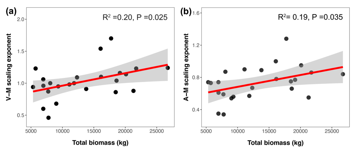 图2|细根V-MA-M 幂指数与树木总生物量之间的关系