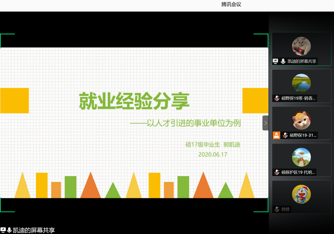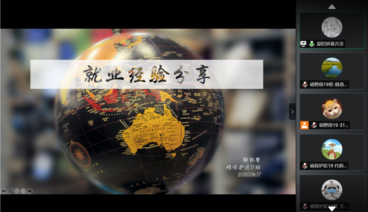 617日,我院于线上顺利开展了“2020年研究生就业经验分享会”。本次活动邀请了郭凯迪、鄢郭馨、刘佳凯三位毕业生分享就业经验。