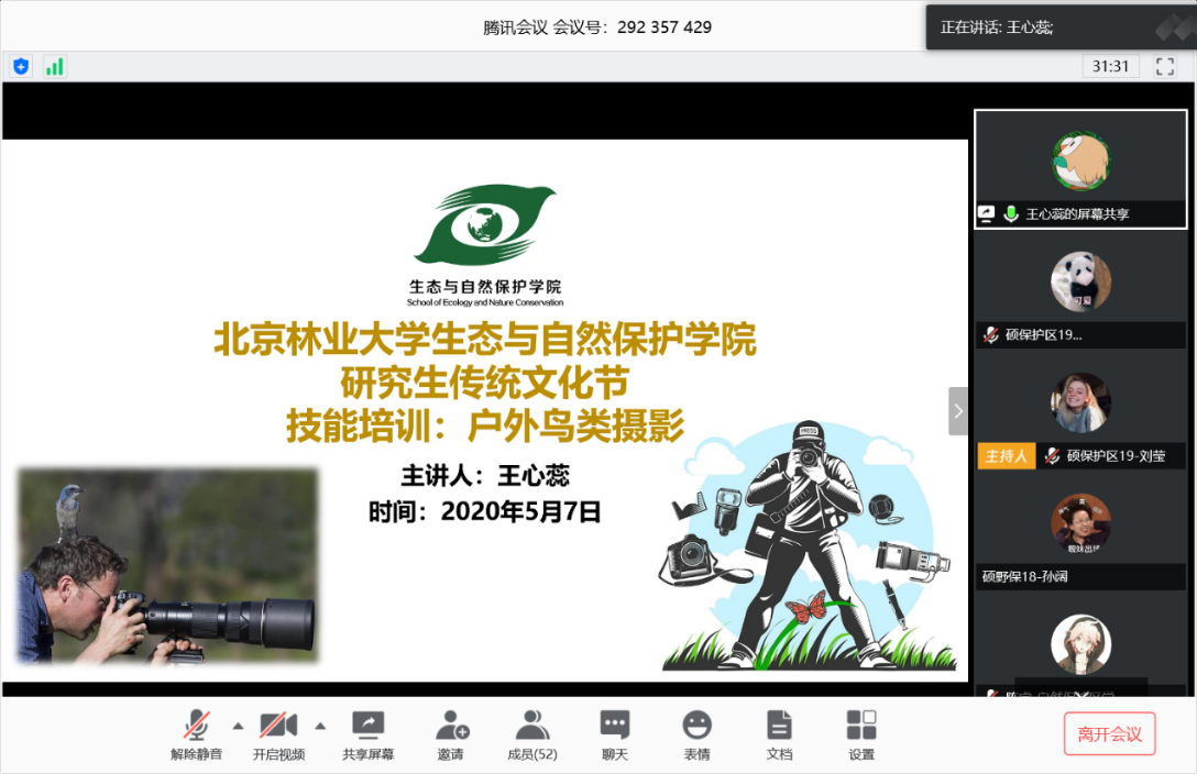 讲座期间,两位分享者与同学们在评论区展开了积极地讨论,热情回答了大家的问题,气氛十分热烈。此次分享吸引了五十多位热爱摄影的学生,帮助大家提升野生动植物摄影技能的同时,引导大家树立了文明摄影的意识,取得圆满成功。