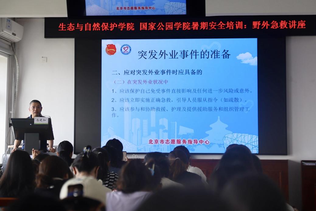 7月9日,生态与自然保护学院 国家公园学院面向全院学生开展暑期外业、社会实践安全培训,邀请了北京现代职业学校医学专业高级教师马建知老师做野外急救专题讲座,全院共100余名学生线下参会,覆盖本研各个年级和所有暑期社会实践团队。