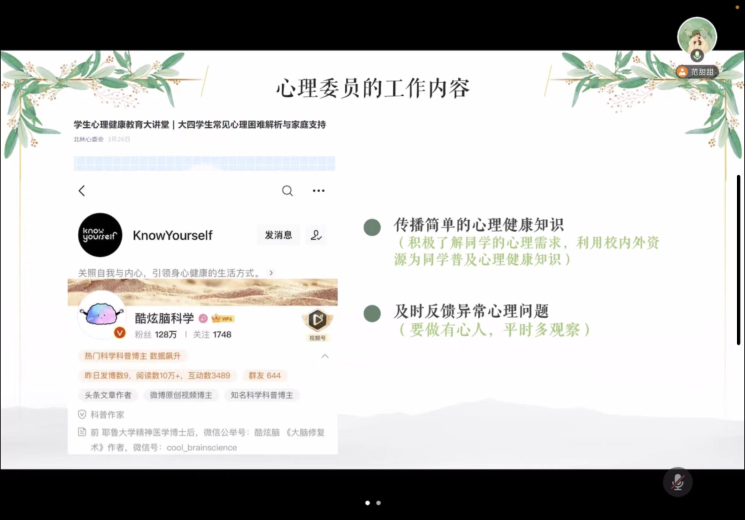 49日,我院二级心理辅导站开展2022年第一期心理委员线上训练营活动,此次培训活动由北京市教育工会心理咨询中心咨询师范甜甜主讲,学院全体心理委员参会。