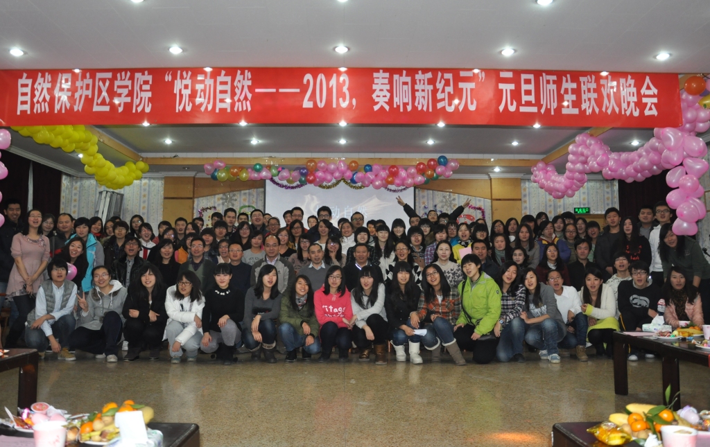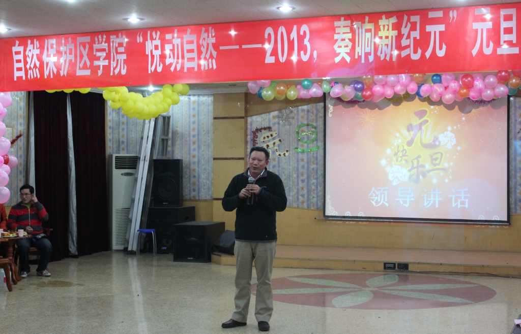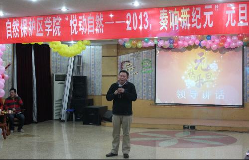 20121220日晚,我院“悦动自然——2013,奏响新纪元”元旦师生联欢晚会在老干部活动中心成功举办。学院院长雷光春教授,学院党总支书记王艳青老师、副院长张明祥、徐基良、徐迎寿、党总支副书记仲艳维等十余位学院领导老师出席晚会并参与联欢。院长雷光春教授在晚会上发表了讲话,表达了对各位老师在过去一年里辛勤工作的感谢以及对全院师生在新年伊始的良好祝愿。