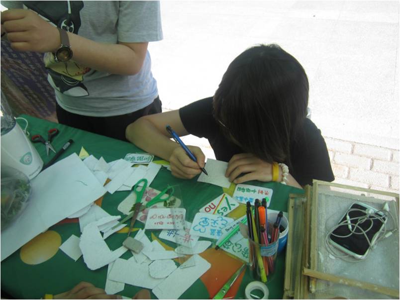 529日,北京林业大学2013年“社团文化节”在校园内举办,这是一次以环保为主题的文化交流活动,各社团以自己独特的形式来向同学们推广环保绿色行为,此次活动中,我院和谐家园志愿者协会推出的活动主题为“再生纸制作”。
