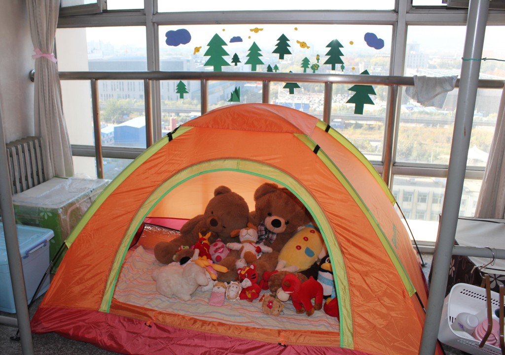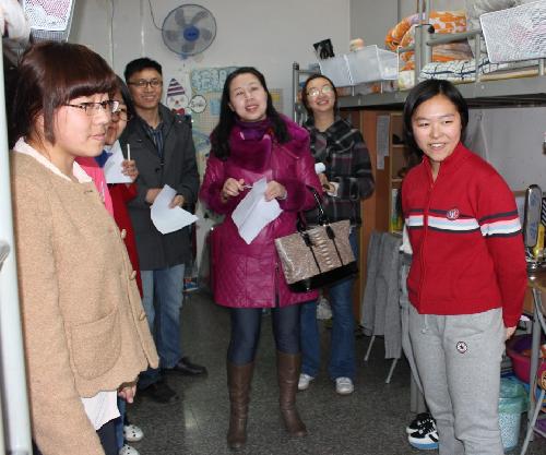 评委们先后参观了各参赛宿舍,由宿舍同学解说自己的寝室布置和设计理念。同学们整洁的宿舍及富于创意的装扮吸引了评委们的眼球,有手绘的吊顶装饰、立体热气球,还有充满野外气息的帐篷,令人仿佛置身大自然。既有可爱玩偶赋予的生活气息,又有满满的书架所带来的学习氛围,精心贴上的墙纸倍受好评,各自的天地风格迥异,展现了大家无限的想象力。其中不乏小巧的手工制作,也有体现出空间的充分利用,虽然空间有限,但同学们丰富的想象力还是让小小的宿舍充满了家的温馨。不同于女生宿舍的可爱精致,男生宿舍显得更为干练整洁,并没有过多的装饰,但墙上的海报和贴有的集体活动照片同样显示出对自已的小集体的热爱,窗台上一株株小的植物为寝室增添了不少生机。