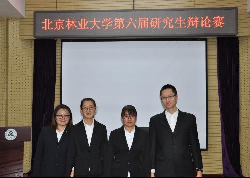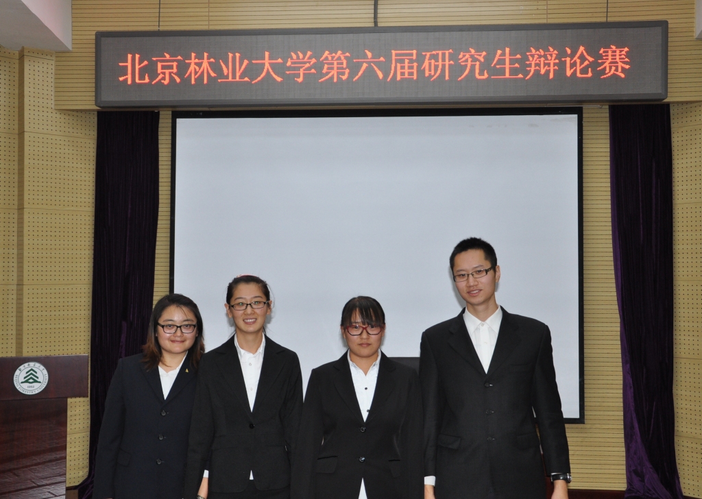 20121121日,我院研究生辩论队参加了在东配楼小报告厅举行的第六届北京林业大学研究生辩论赛四强赛。此次我院研究生辩论队由姚新颖、王永阳、王旸和赵丹丹组成。