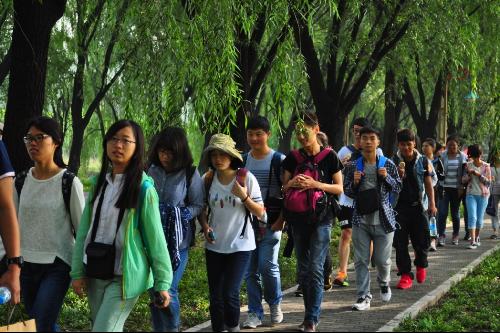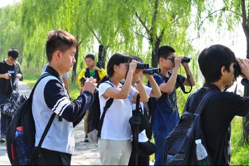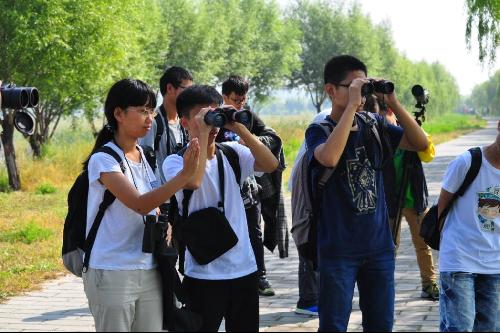 进入野鸭湖自然保护区,自然保护区学院2015级新生充满激动和好奇。学院选派了部分具有较好专业基础的高年级学生担任本次野外考察的向导,为新生沿途介绍专业基础知识、带领新生认知动植物、观察和辨别鸟类。