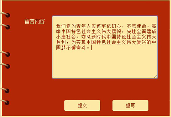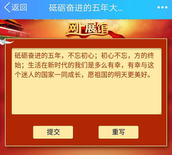 学院学生以党团支部、班级、宿舍为单位,通过PC端与手机端等方式进入网上展馆观展留言。“砥砺奋进的五年”成就展网上展馆采用360度全景观展技术,使同学们身临其境,点击各个通道处的方向箭头,就可以进入相应展区参观展览。同学们对这种突破实体展的时空局限性,利用图文、视频、三维模型等深度资料全方位了解党和国家重大事业成就的方式表示了积极响应,纷纷在展馆页面留言,表达对党和国家取得重大成就的骄傲与自豪之情,并留下了对党和国家光明未来的祝福与为中华民族伟大复兴的宏伟蓝图贡献自己力量的坚定决心。